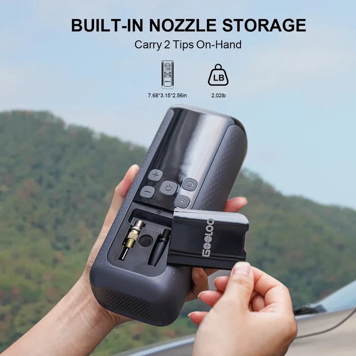 š” 3-in-1 Versatility ā Tire pump + power bank + LED light + magnetic nozzle storage (±1 PSI precision).